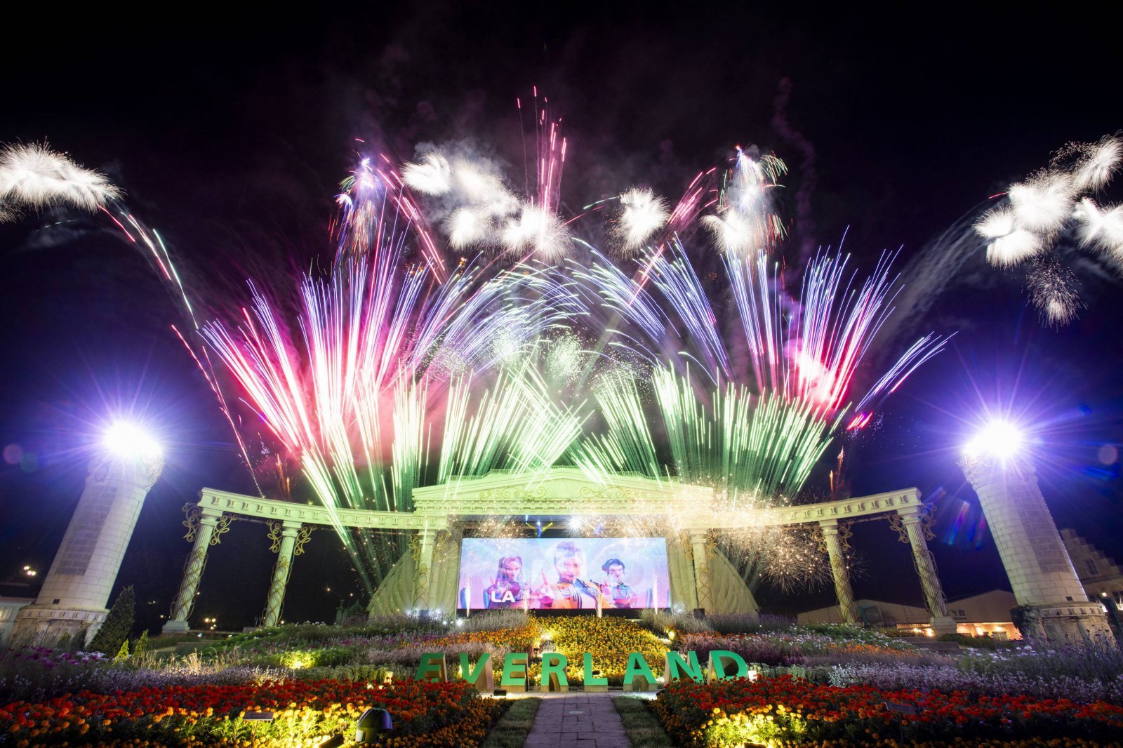 에버랜드 포시즌스가든에서 펼쳐지는 ‘케이팝 데몬 헌터스 싱어롱 불꽃쇼’ 현장