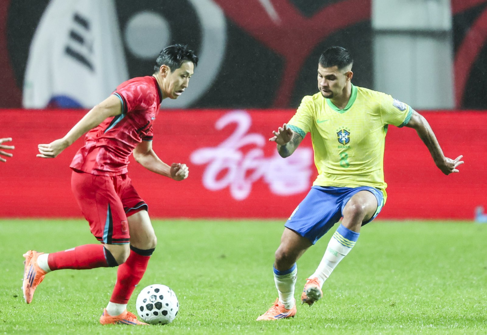 브루노 기마랑이스 브라질 대표팀 미드필더(오른쪽)가 10일 서울월드컵경기장에서 열린 한국과 친선전 도중 이강인의 돌파를 막고 있다. 상암|뉴시스