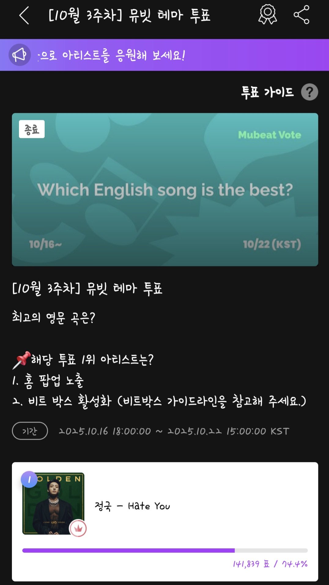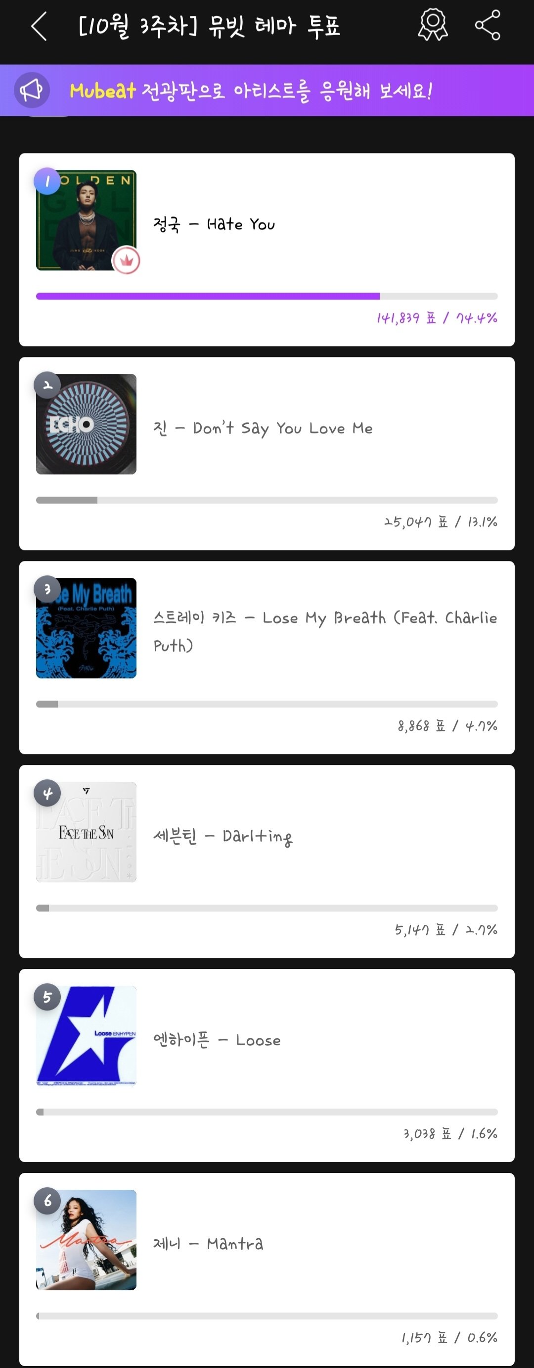 글로벌 K-팝 플랫폼 뮤빗(Mubeat)은 10월 16일부터 22일까지 ‘최고의 영문 곡은?’이라는 주제로 진행한 투표 결과, 정국의 ‘Hate You’가 14만1839표를 얻어 전체 득표의 74.4%를 차지하며 1위에 올랐다고 밝혔다.