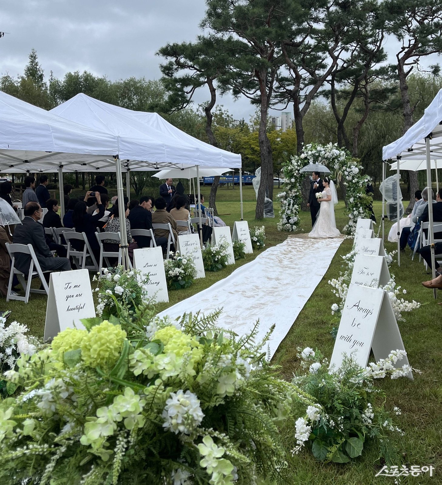 빛가람호수공원에서 열린 2호 커플의 예식은 가을비 속에서도 영화 ‘어바웃타임’을 떠올리게 하는 따뜻한 분위기 속에 진행됐다.