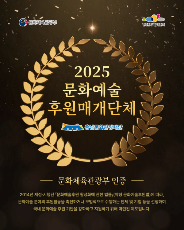 충남문화관광재단(대표 이기진)이 문화체육관광부가 주관하고 한국문화예술위원회가 운영하는 ‘2025년도 문화예술후원매개단체 인증제도’에서 신규 인증기관으로 선정됐다.