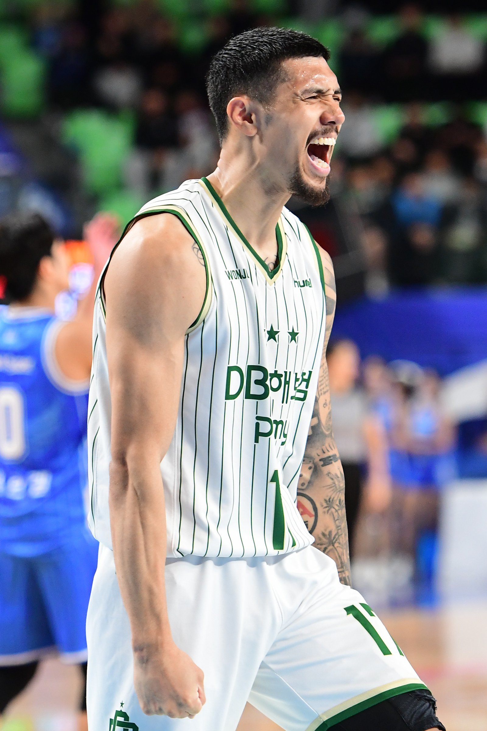 DB 알바노는 데뷔 후 최고의 활약을 펼치며 팀의 에이스 역할을 해내고 있다. 슛 정확도까지 살아난 덕분에 엄청난 효율을 자랑한다. 개인 통산 2번째 트리플 더블을 작성한 29일 대구 가스공사전에서 포효하는 알바노. 사진제공ㅣKBL