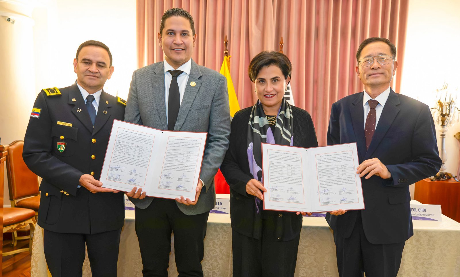 27일(현지시간) 에콰도르 피친차주 키토 외교부 청사 내 강당에서 열린 위러브유 소방 장비 기증식에서 참석자들이 기증서를 들고 기념촬영을 하고 있다. 왼쪽부터 워싱턴 볼리바르 아르세 로드리게스 키토 소방청 부청장, 호르헤 카리요 투티벤 국가재난관리처장, 마리아 가브리엘라 소메르펠드 로세로 외교부 장관, 최기철 위러브유 에콰도르 키토 지부장.