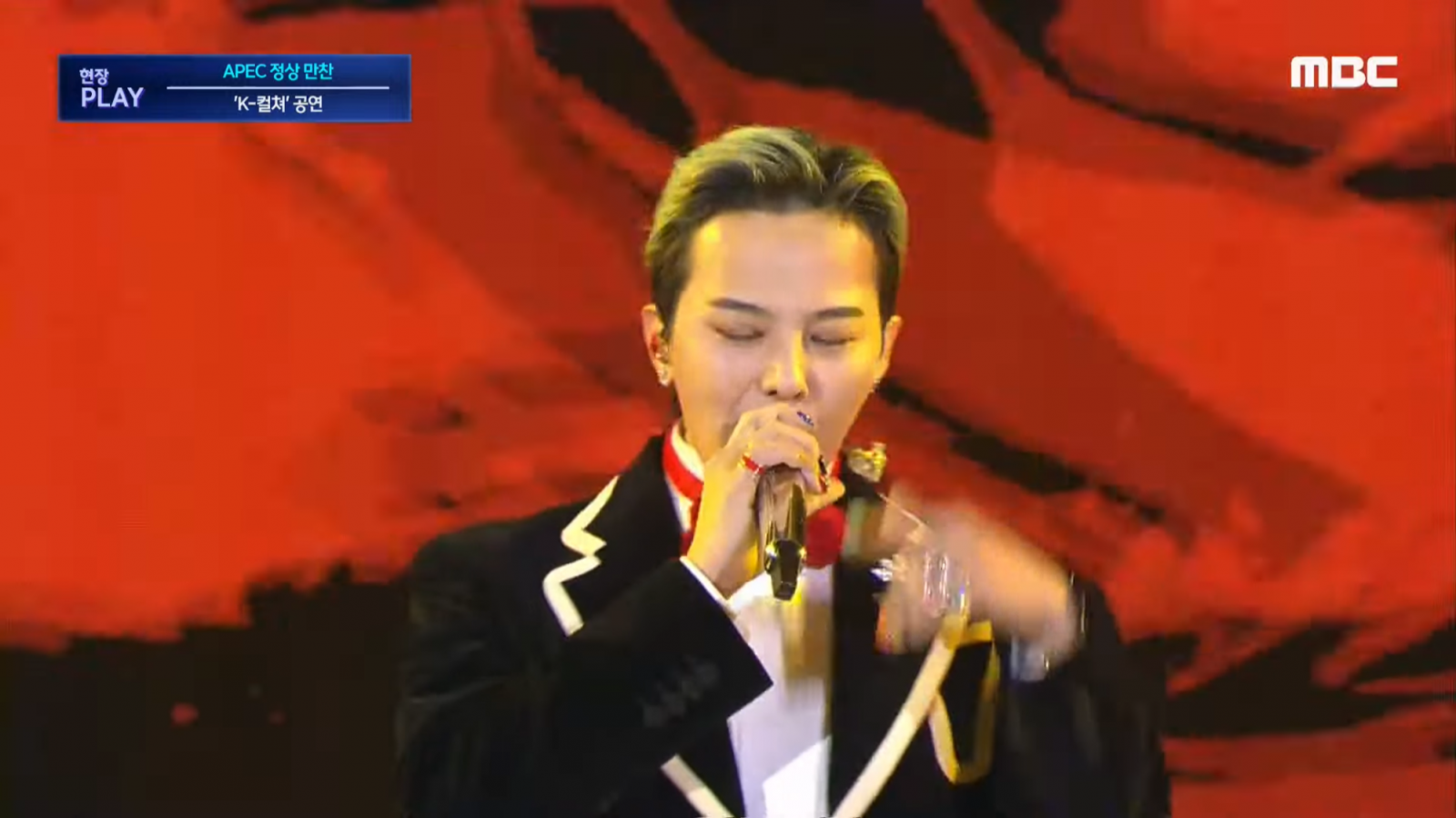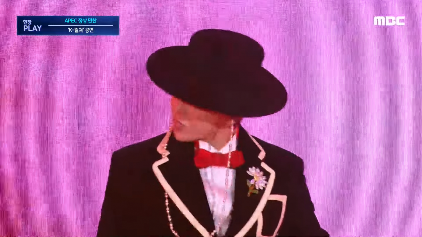 이어 APEC 2025 공식 홍보대사 지드래곤이 축하공연 무대에 섰다. 그는 ‘파워’, ‘드라마’, ‘홈 스윗 홈’ 등 3곡을 연달아 선보이며 글로벌 무대를 압도했다. 특히 ‘파워’ 무대에서는 중절모에 진주 장식 끈을 매달아 마치 한국 전통의 갓을 연상시키는 스타일을 연출해 폭발적인 반응을 얻었다.