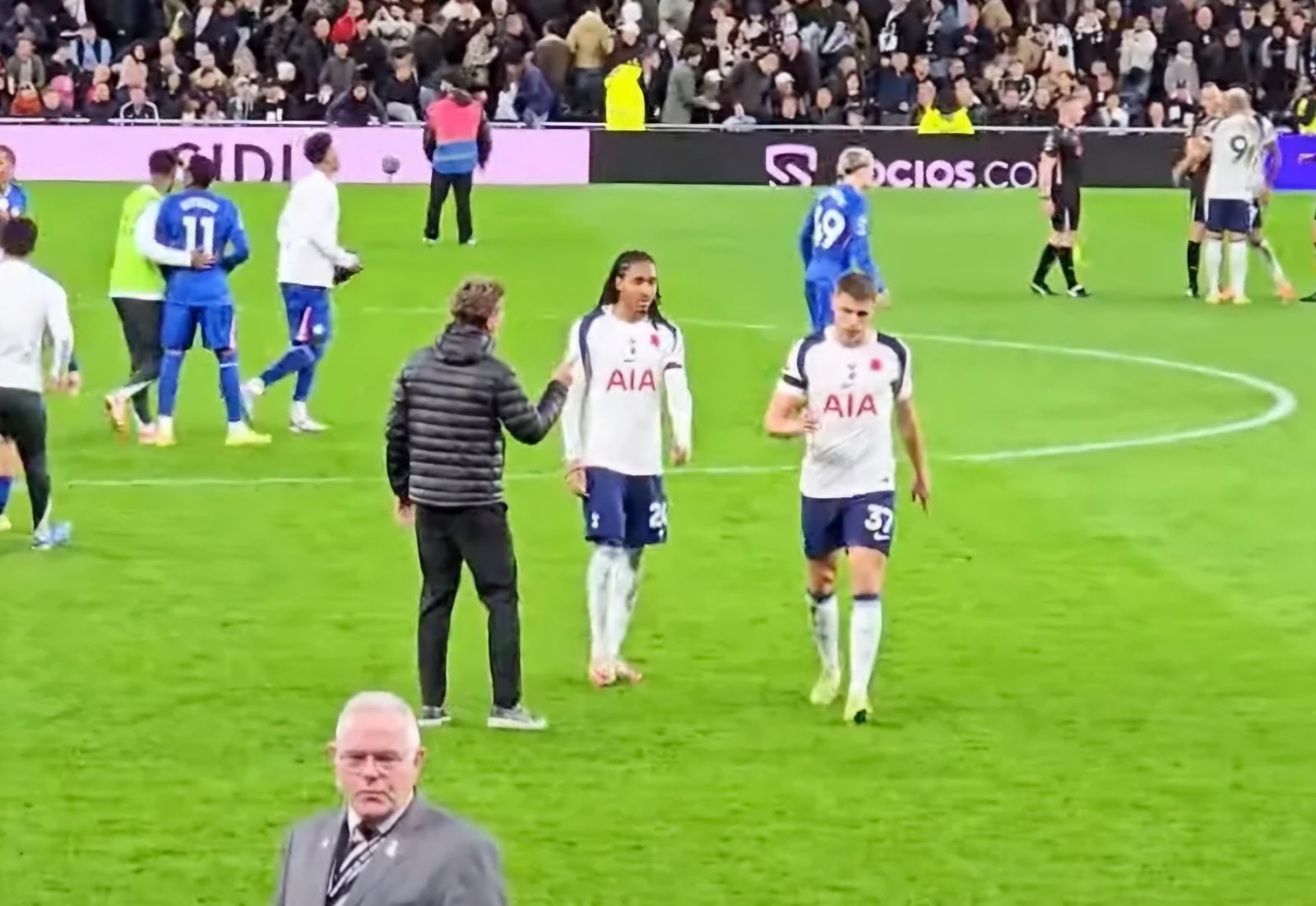 토마스 프랑크 감독이 첼시전 직후 청한 악수를 거부한 미키 판더펜과 제드 스펜스. 한 토트넘 팬이 유튜브에 올린 영상이 화제를 낳고 있다. 영상캡처|유튜브