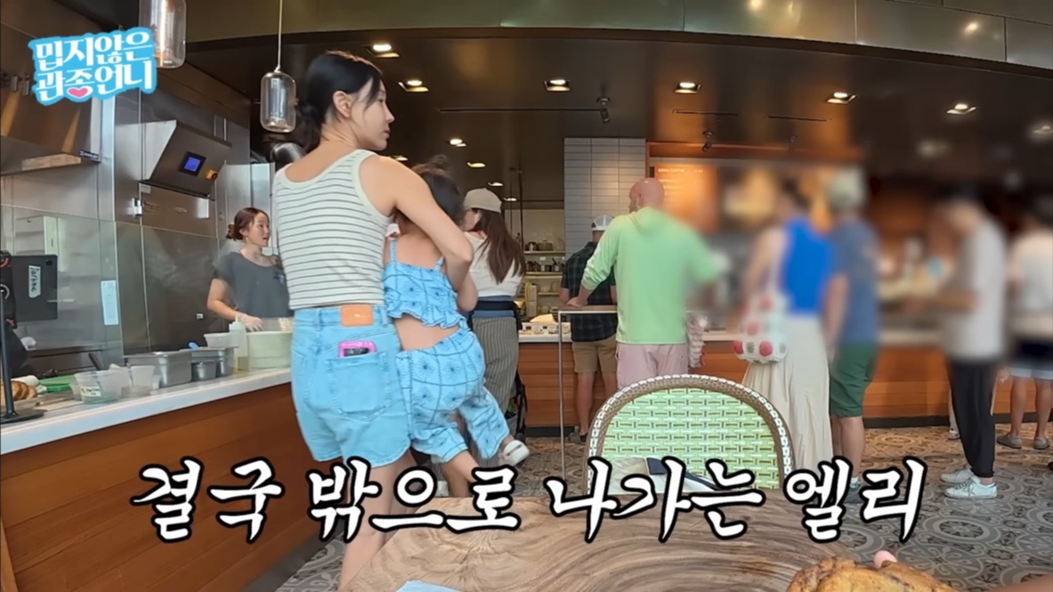 둘째 엘리는 이지혜가 주문할 때 특정 빵을 먹고 싶다고 졸랐지만 이미 여러 종류를 주문한 이지혜는 “너무 많다”며 단호히 거절했다. 이어 “애들이 떼쓰기 시작하면 모른 척해야 한다”고 말했다. 그러나 자리에 앉은 뒤에도 엘리는 “싫어”, “아니야”를 반복하며 울음을 터뜨렸다.