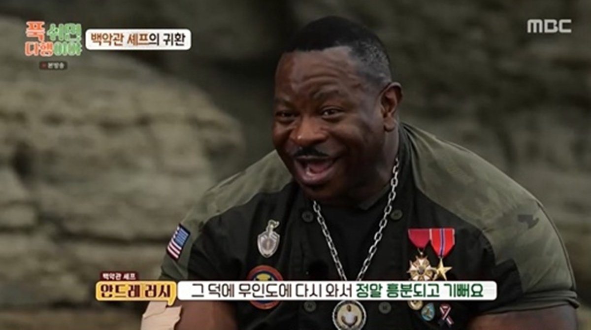 이어 이모카세와 안드레 러시는 오징어를 이용한 요리를 선보였다. 이모카세는 ‘김치 오징어 만두’를, 안드레 러시는 ‘오징어 두루치기’를 만들었다. 안드레 러시는 솥뚜껑을 이용해 캡틴 아메리카 포스를 발휘하며 무인도 주방을 완전히 장악했다. 안드레 러시의 매콤한 ‘오징어 두루치기’와 이모카세의 시원한 ‘김치 오징어 만두전골’이 조화를 이루며 무인도 레스토랑 손님들에게 최고의 맛을 선사했다.