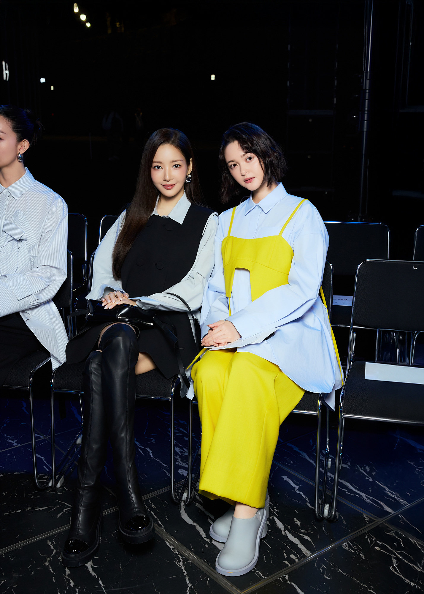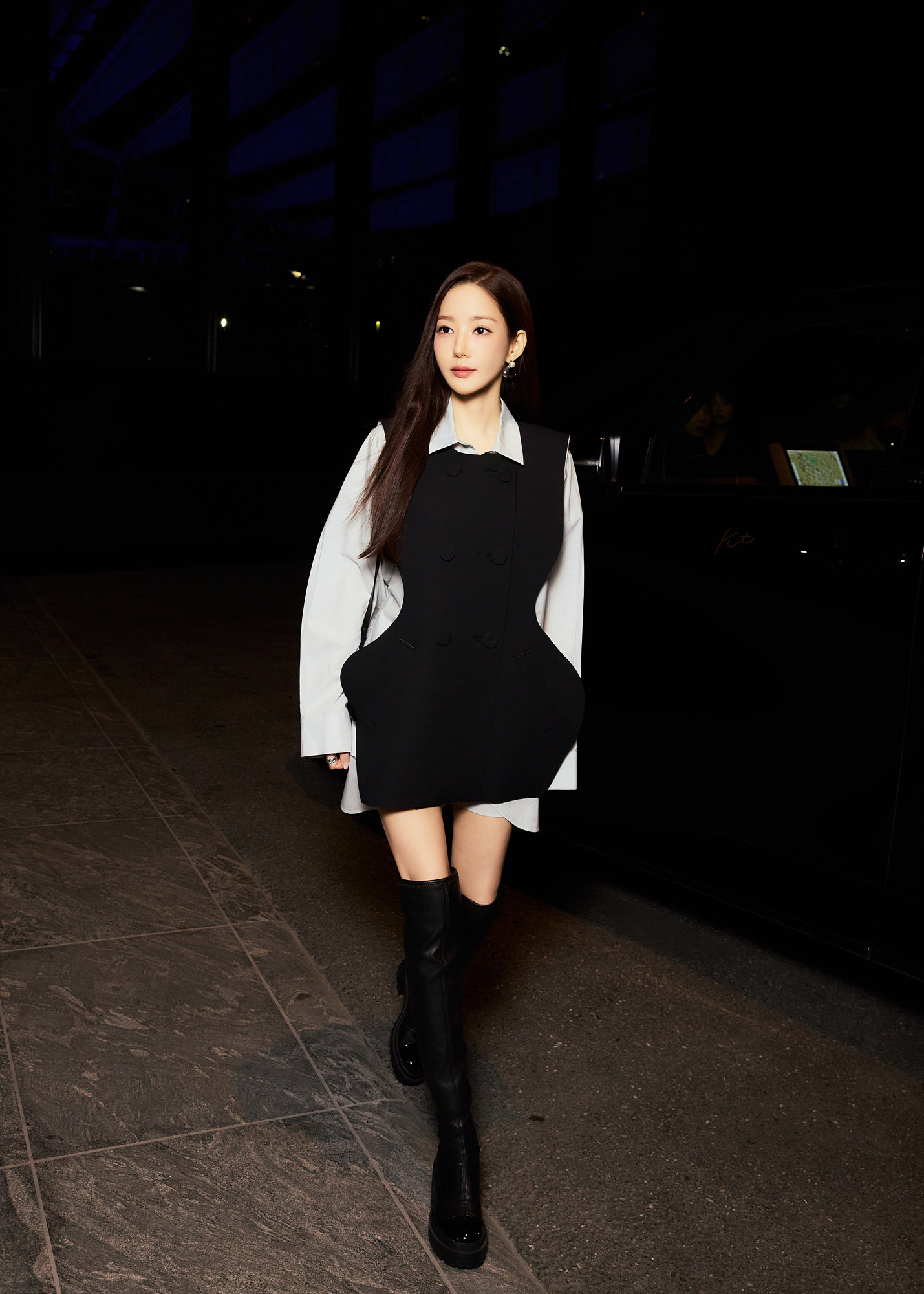 박민영은 간결하면서도 구조적인 블랙 베스트를 페일 그레이 셔츠와 매치한 미니드레스 룩으로 등장했다. 세련되고 우아한 실루엣 속에서 절제된 카리스마를 뽐내며, 엔폴드가 지향하는 모던 감성과 완벽한 조화를 이뤘다.