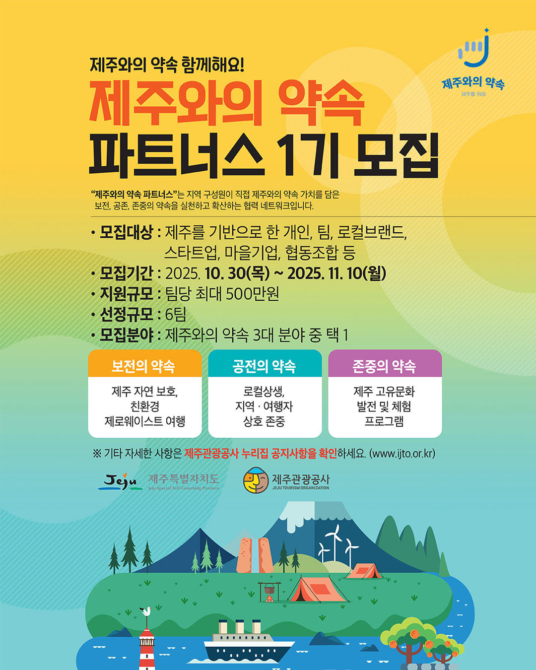 제주특별자치도와 제주관광공사(사장 고승철)가 제주 관광의 지속가능성을 높이기 위한 ‘제주와의 약속 파트너스’ 공모를 11월 10일까지 진행한다.