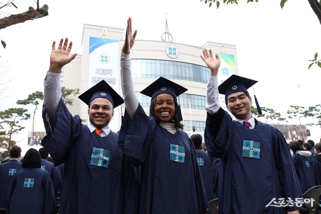 2일 신천지예수교 증거장막성전 청주교회에서 열린 ‘시온기독교선교센터 116기 수료식’에 참여한 수료생들이 서로의 수료를 축하하며 기념촬영을 하고 있다. (사진제공=신천지예수교회)