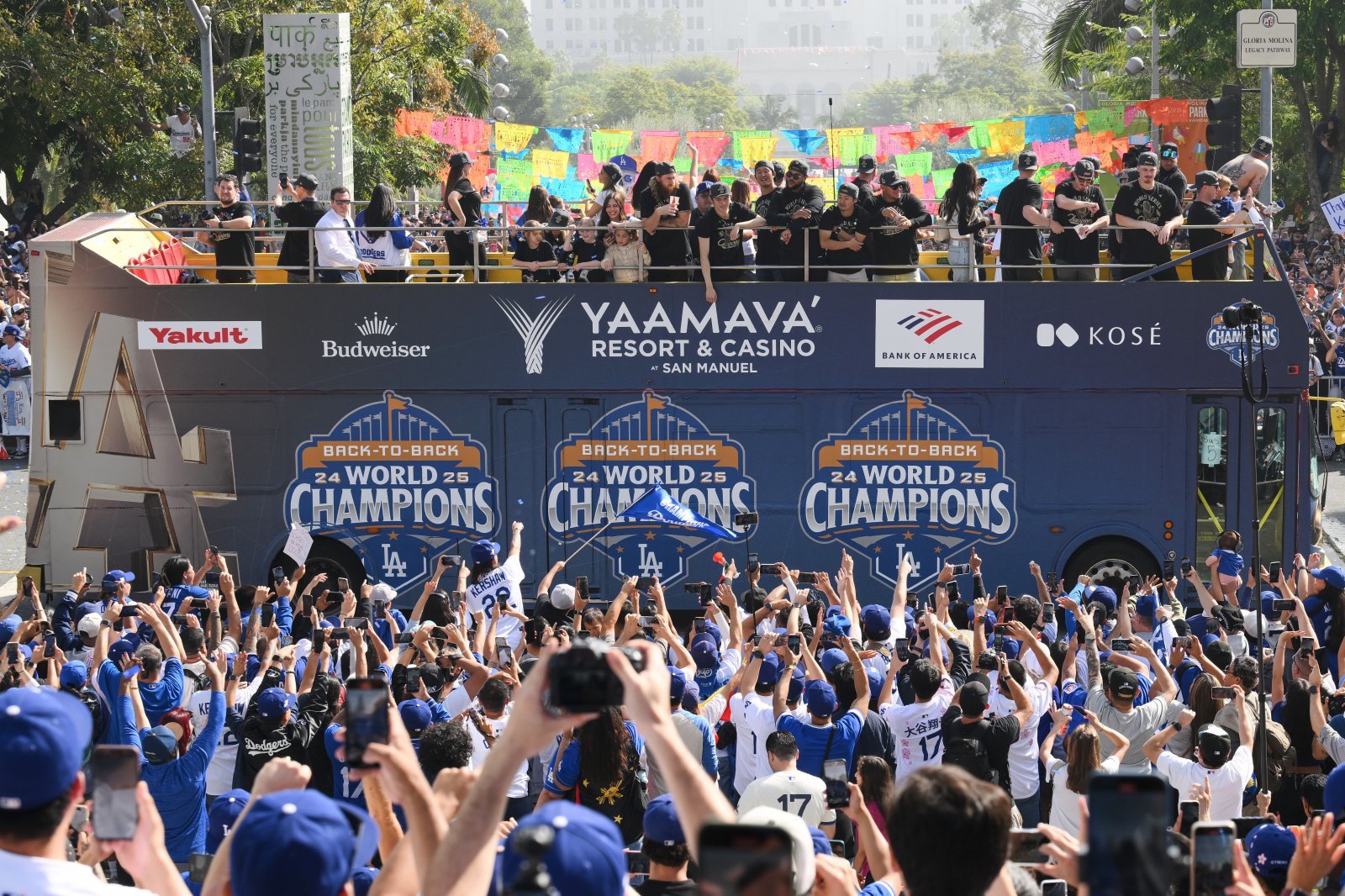 원정 경기에서 우승을 확정한 다저스 선수단은 홈 팬들을 위해 4일 2층 버스에 올라탔다. 선수단을 비롯해 코칭스태프, 구단 프런트 직원들도 함께 버스에 탑승했고, 버스는 LA 템플 스트리트와 브로드웨이 교차로에서 출발해 LA 도심을 가로질렀다.