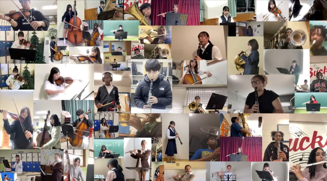 MBS 문산수억고 방송부가 제작한 BTS ‘Dynamite’ - Global Youth Orchestra Cover(100 Students, 4 Countries Unite) 유튜브 영상의 한 장면