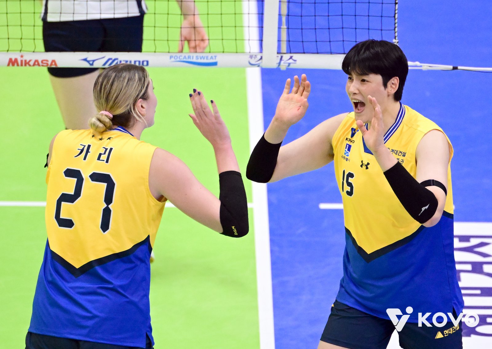 V리그 여자부 현대건설이 IBK기업은행을 꺾고 선두로 도약했다. 미들블로커(센터) 김희진과 아포짓 스파이커(라이트) 카리 가이스버거(미국·등록명 카리)의 활약이 결정적이었다.