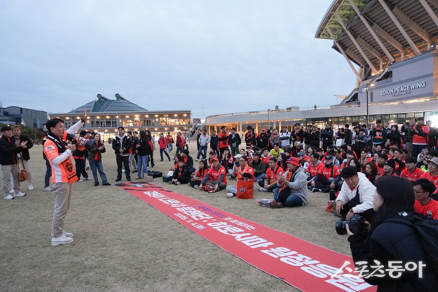 강원특별자치도(도지사 김진태)는 지난 11월 4일 오후 5시 30분, 일본 히로시마 에디온 피스 윙 스타디움 원정석 게이트 앞에서 ‘강원FC 승리기원 행사’를 개최했다.사진제공|강원도