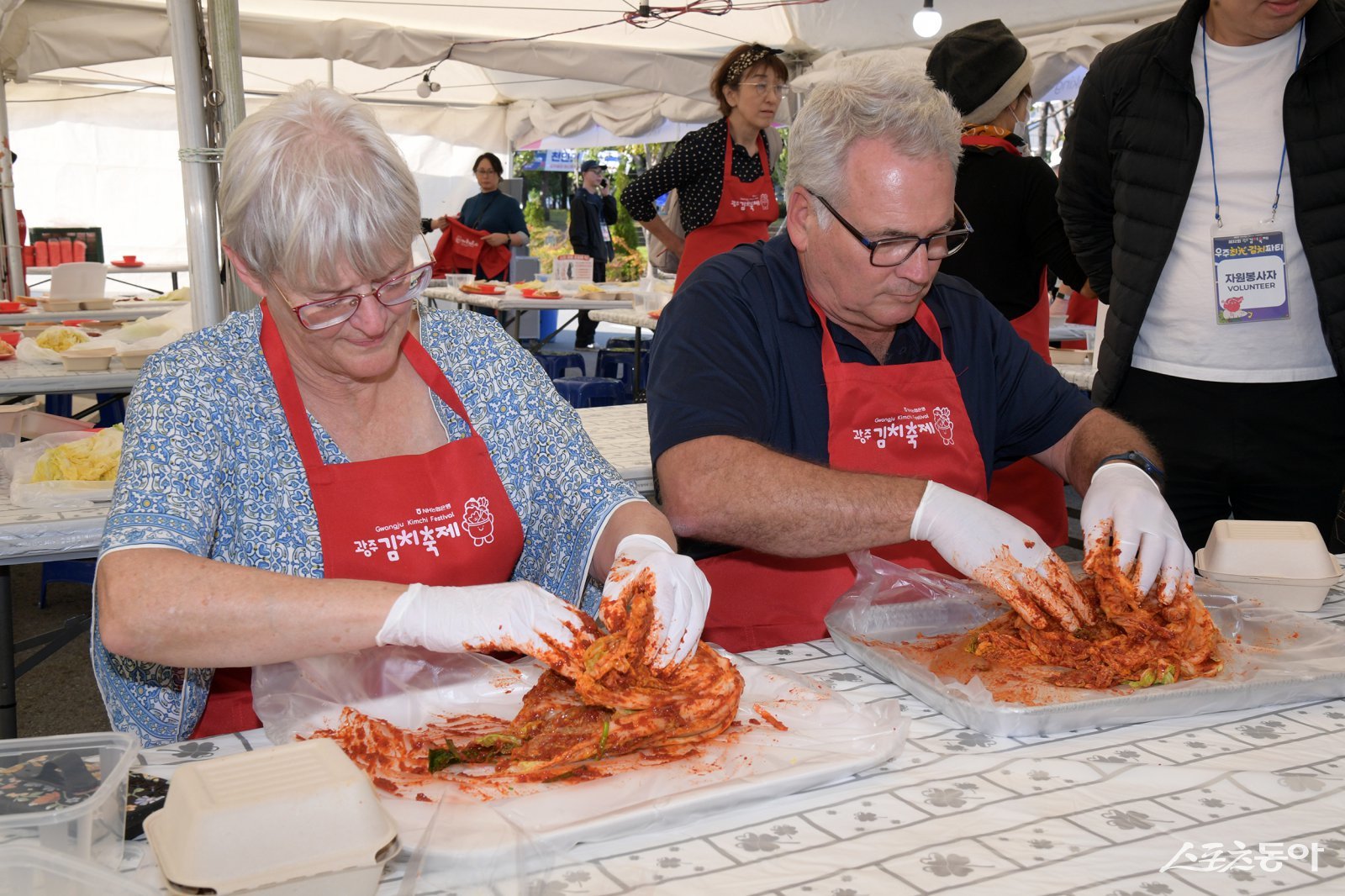 외국인 관광객이 광주김치축제에서 김치를 체험하고 있다. 사진제공=광주광역시