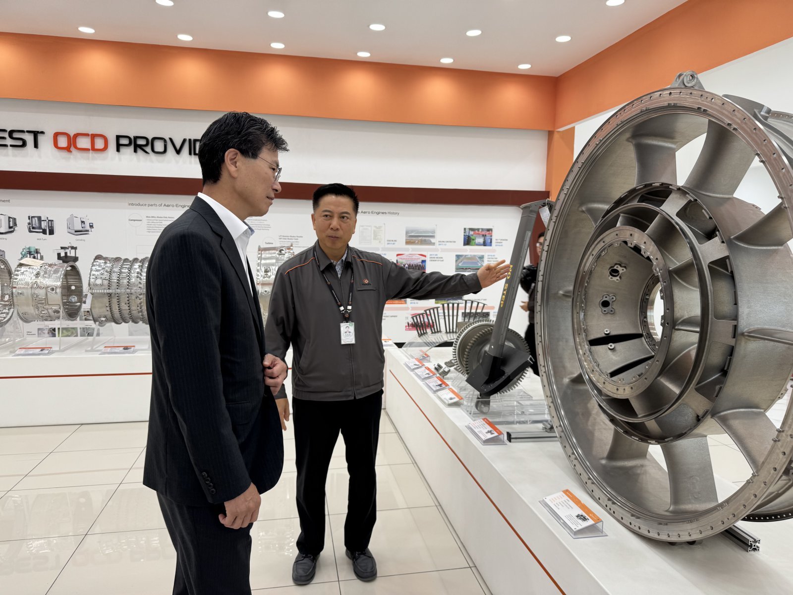 베트남 하노이 인근 소재 한화에어로엔진 공장에서 부품 관련 설명을 듣고 있는 강태영 행장(왼쪽). 사진제공|NH농협은행