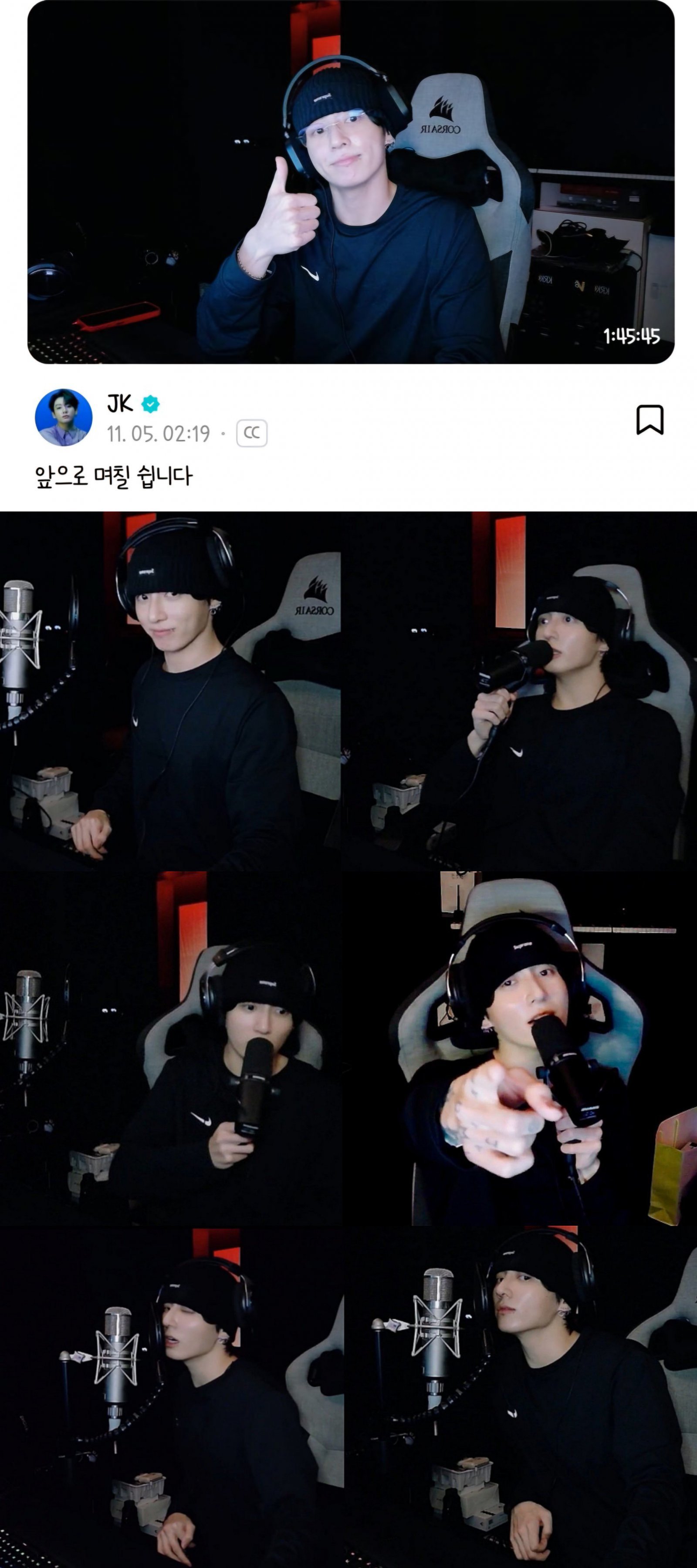 5일 새벽, 정국은 팬 커뮤니티 위버스를 통해 ‘앞으로 며칠 쉽니다’라는 제목으로 개인 라이브 방송을 열었다. 직접 조명과 카메라, 마이크를 세팅한 그는 약 10곡의 노래를 생라이브로 부르며 팬들의 새벽을 감성으로 물들였다.