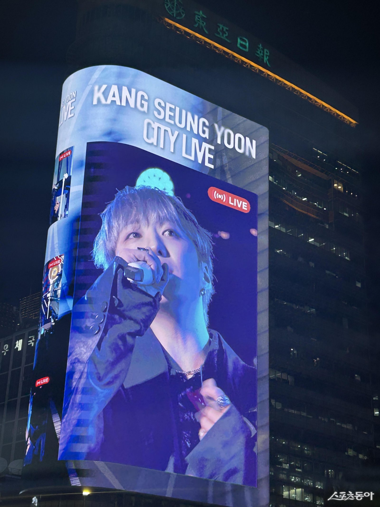 서울의 새로운 상징 ‘룩스’(LUUX)를 라이브로 가득 채운 ‘1호 가수’는 강승윤이었다. 룩스는 서울 세종대로 사거리의 랜드마크 동아미디어센터를 둥글게 감싼 ‘초대형 전광판’이다. 총면적 3000㎡로 배구장12개 가량을 합쳐놓은 압도적 스케일을 자랑한다.