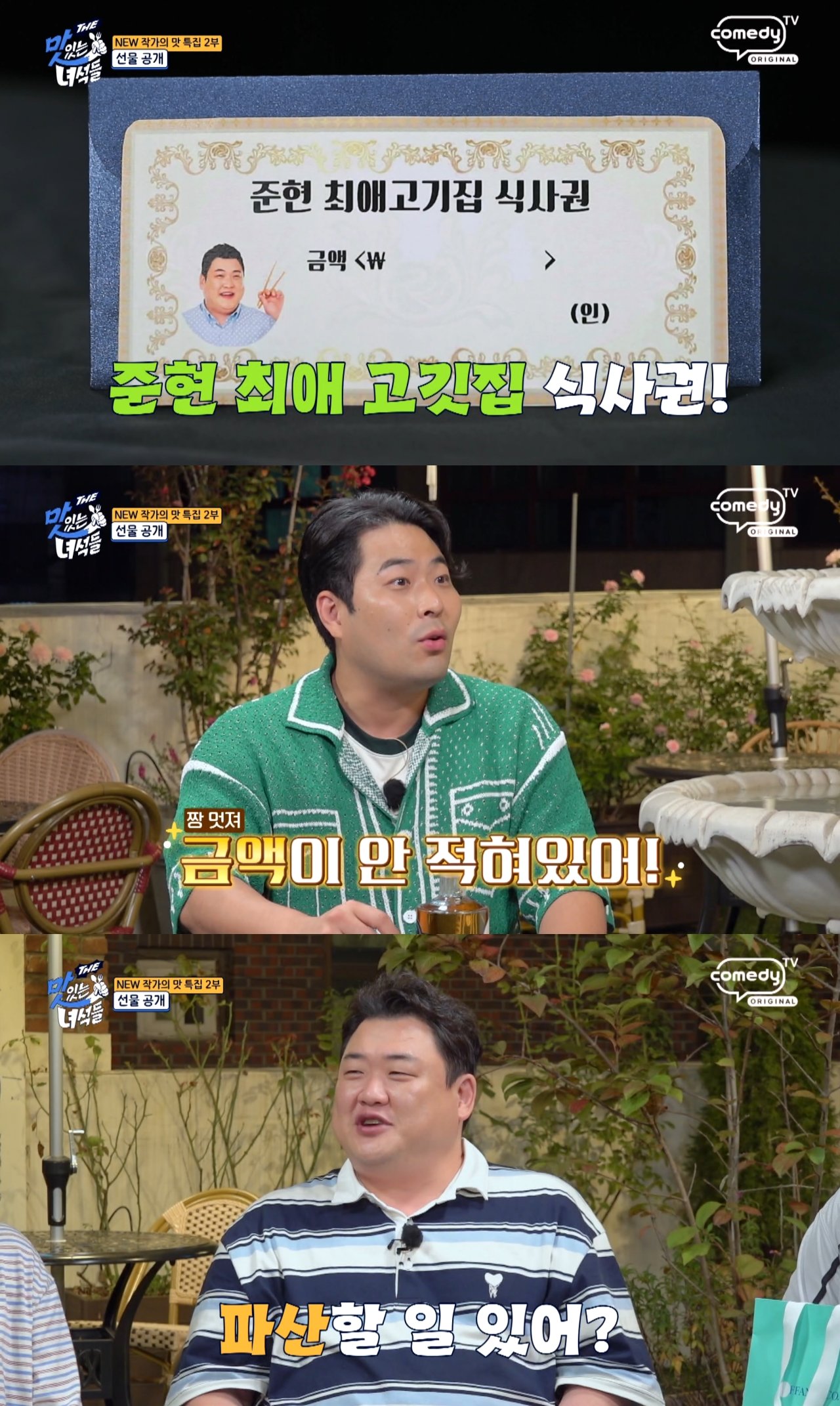 이날 가장 시선을 끈 건 김준현이 준비한 최애 고깃집 식사권으로 이를 본 김해준은 “준현이 형이 진짜 멋있다고 생각한 게, 금액이 안 써 있다. 백지 식사권이다!”라며 감탄한다.