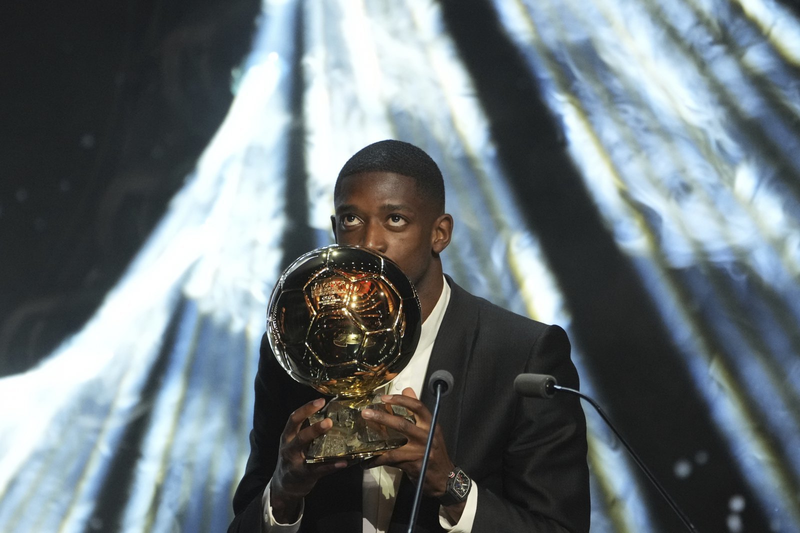 PSG 우스만 뎀벨레가 9월 23일(한국시간) 프랑스 파리 테아트르 뒤 샤틀레에서 열린 제69회 발롱도르 시상식서 2025 남자 선수상을 수상한 뒤 감격스런 표정을 지어보이고 있다. 파리|뉴시스