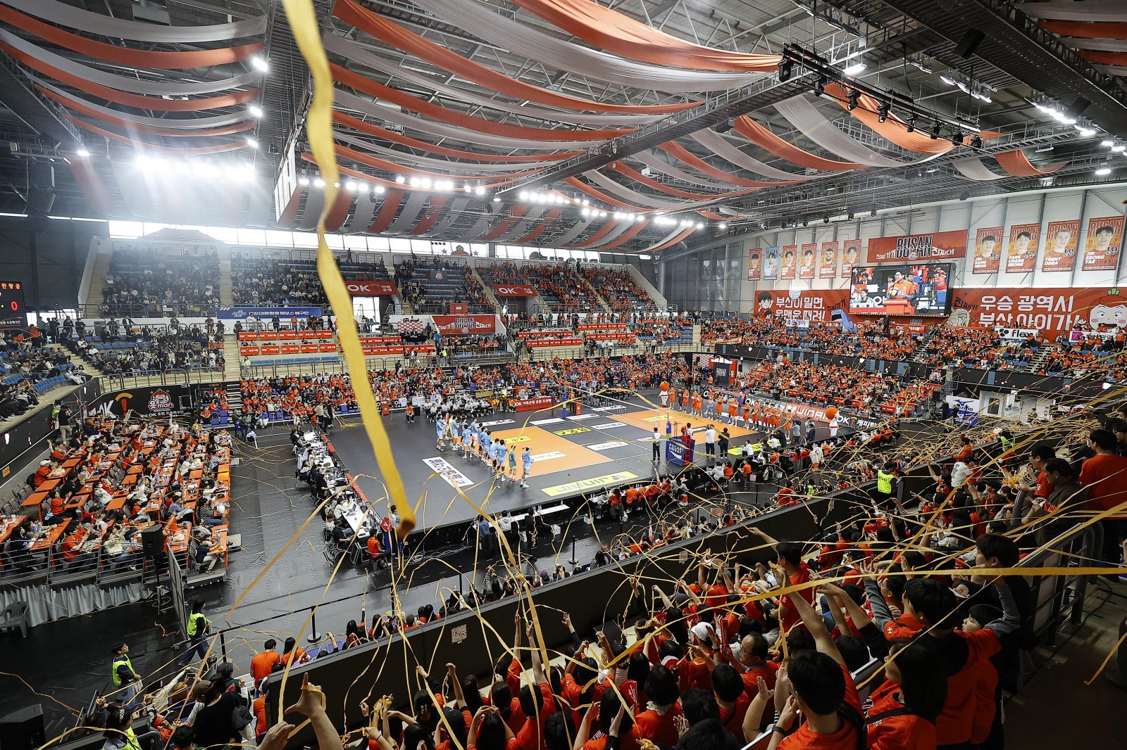 OK저축은행과 대한항공의 ‘진에어 2025~2026 V리그’ 남자부 1라운드 경기가 열린 9일 부산 강서체육관은 주황색으로 물들었다. 이달 3일 온라인 예매창구를 개방하자마자 하루만에 4067석이 전석 매진됐다. 이날 현장에서 판매한 입석티켓을 233명이 구매해 총 4270명이 입장했다.