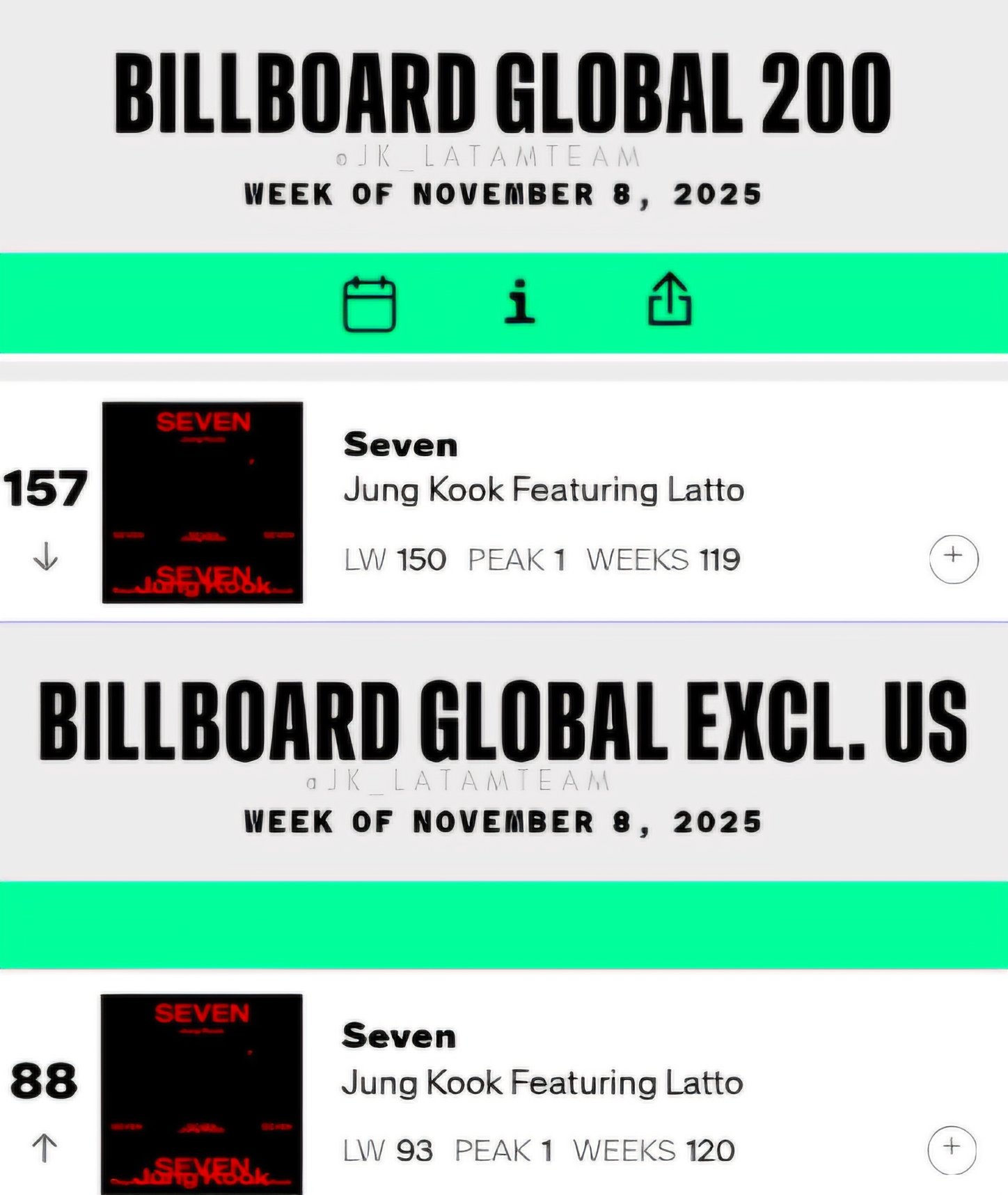 미국 음악 전문매체 빌보드가 11월 8일 자 차트를 발표한 결과, 정국의 솔로 데뷔곡 ‘Seven’이 ‘글로벌 200’에서 157위를 기록했다. 이로써 ‘Seven’은 해당 차트에 119주 연속 진입하며 아시아 가수 가운데 ‘최초’이자 ‘최장’ 기록을 동시에 세웠다.