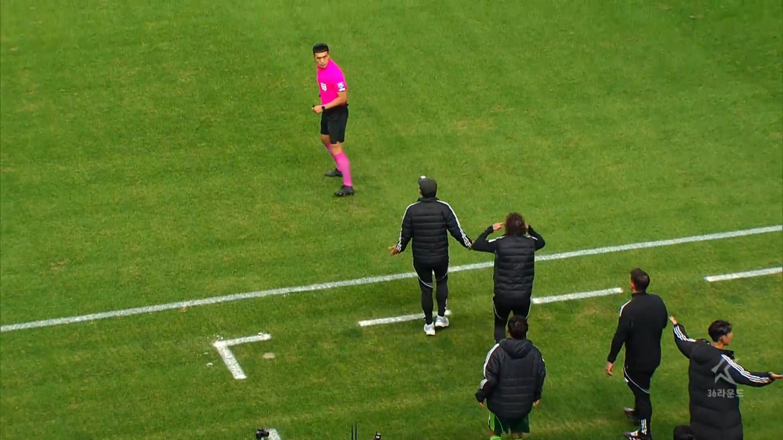 눈을 찢는 행위였을까? 똑바로 판정하라는 의미일까? 타리코 전북 코치가 8일 전주월드컵경기장서 열린 대전하나전 도중 했던 손가락 제스처에 대한 해석을 놓고 심판들과 전북의 입장이 평행선을 달린 가운데 한국프로축구심판협의회가 빠르게 ‘인종차별’로 규정했다. 사진출처|쿠팡플레이 중계화면 캡처