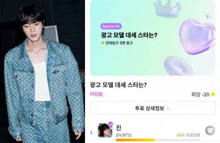 방탄소년단(BTS) 진이 마이원픽(MY1PICK)에서 진행된 ‘광고 모델 대세 스타는?’ 투표에서 46%의 압도적인 득표율로 1위를 차지했다. 단순한 인기 투표가 아니라, ‘어떤 얼굴이 브랜드의 신뢰를 완성하는가’에 대한 해답이었다.
