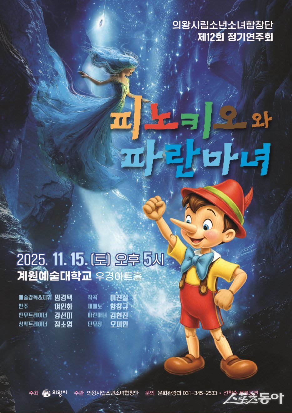 의왕시(시장 김성제)가 주최하고 의왕시립소년소녀합창단이 주관하는 제12회 정기연주회 ‘피노키오와 파란마녀’가 오는 11월 15일 오후 5시, 우경아트홀에서 열린다(시립소년소녀합창단 12회 연주회 포스터(피노키오와 파란마녀)). 사진제공|의왕시