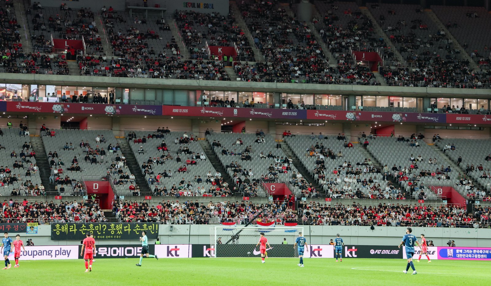 2026북중미월드컵이 7개월 앞으로 다가온 현재 아직까진 월드컵 시즌 특수가 감지되지 않는다. 볼리비아(14일), 가나(18일)와 11월 A매치 2경기 예매도 지지부진해 축구팬들의 싸늘한 민심만 다시 확인할 가능성이 높다. 사진은 지난달 14일 서울월드컵경기장에서 열린 파라과이와 친선경기에서 보인 텅텅 빈 관중석. 뉴시스