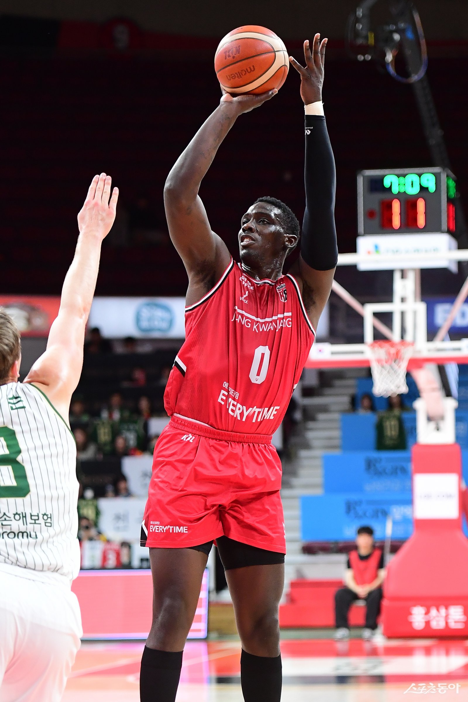 정관장 조니 오브라이언트가 13일 안양정관장아레나에서 열린 DB와 홈경기 도중 슛을 시도하고 있다. 사진제공|KBL