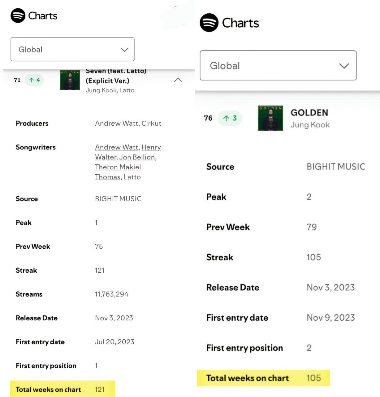 정국의 첫 솔로 데뷔곡 ‘Seven’은 스포티파이 10월 31일~11월 6일 자 ‘위클리 톱 송 글로벌’ 차트에서 71위에 이름을 올렸다. 2023년 공개된 곡임에도 3주째 순위가 오르며 초장기 흥행력을 이어가고 있다. 해당 곡은 아시아 솔로 가수 최초·최장 기록인 121주 연속 차트인을 달성해 롱런 신화를 확장했다.