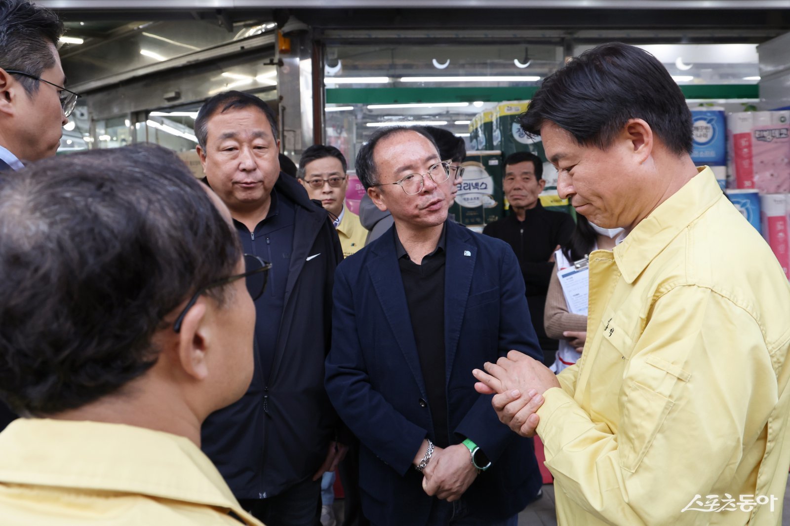 조용익 부천시장(오른쪽)이 13일 트럭 돌진 사고가 있었던 시장을 방문해 전국 전통시장 상인연합회 회장(오른쪽에서 두 번째) 및 부천시 전통시장 연합회 사무국장(오른쪽에서 세 번째)의 이야기를 듣고 있다. 사진제공|부천시