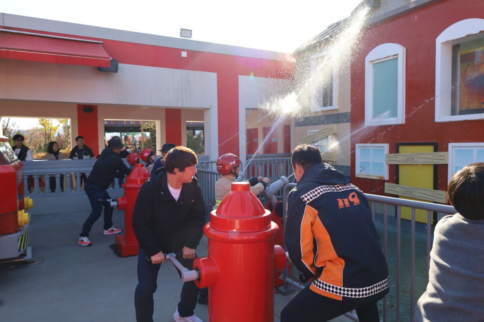 행사는 레고랜드 캐슬 스테이지에서 진행된 어린이 OX퀴즈로 시작됐다. 화재 예방 기본 지식과 안전 행동 요령을 담은 문제가 이어졌고, 어린이와 부모들이 함께 정답을 고민하며 교육과 놀이가 자연스럽게 이어졌다. OX퀴즈 최종 우승 다섯 팀에게는 특별한 체험이 기다렸다. 레고랜드 시티 ‘파이어 아카데미’에서 춘천소방서 대원과 함께 실제 소방관처럼 출동 과정과 진화 시연을 체험하는 순서가 진행된 것이다.