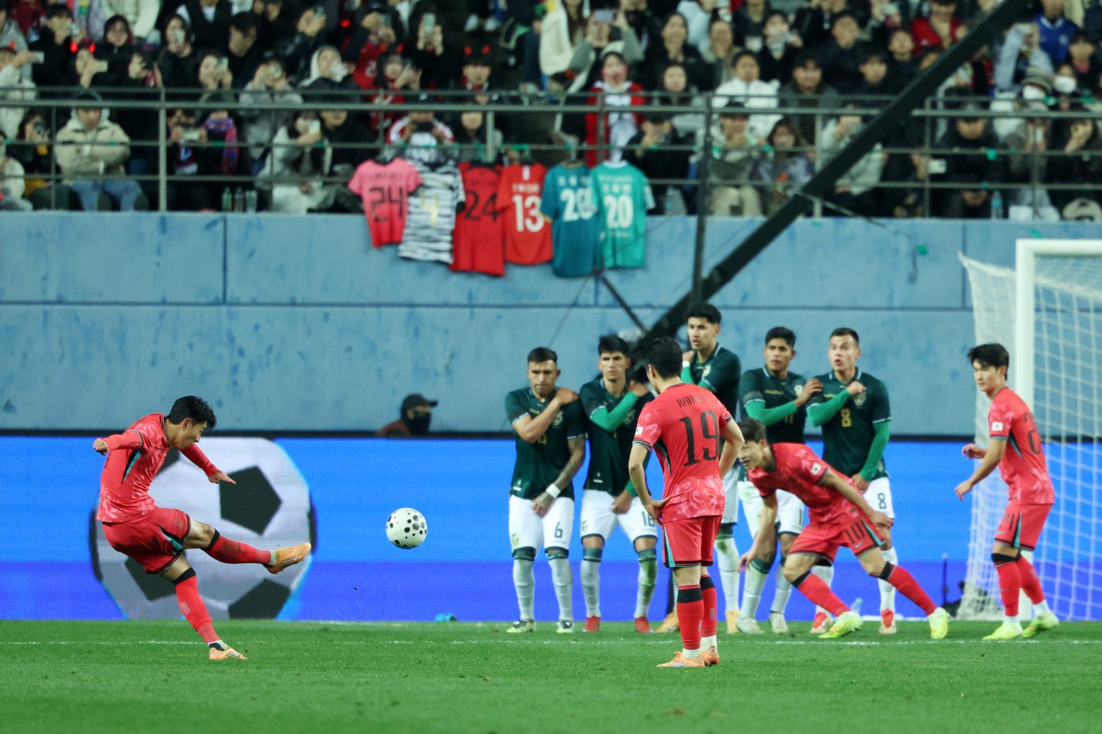결정적 찬스는 후반 12분 찾아왔다. 황희찬이 과감한 돌파를 하다 문전 왼쪽에서 프리킥을 얻어냈다. 이를 손흥민이 날카로운 오른발 감아차기로 골망을 갈랐다. 볼리비아 수비벽 머리를 스친 볼은 골대 왼쪽 상단에 정확히 꽂혔다.
