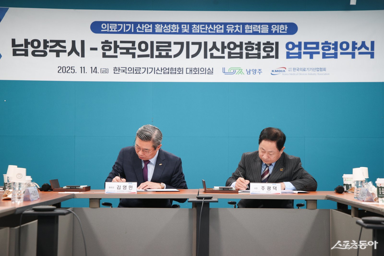 김영민 회장과 주광덕 시장(우)이 14일 사단법인 한국의료기기산업협회에서 업무협약서에 서명하고 있다. 사진제공ㅣ남양주시
