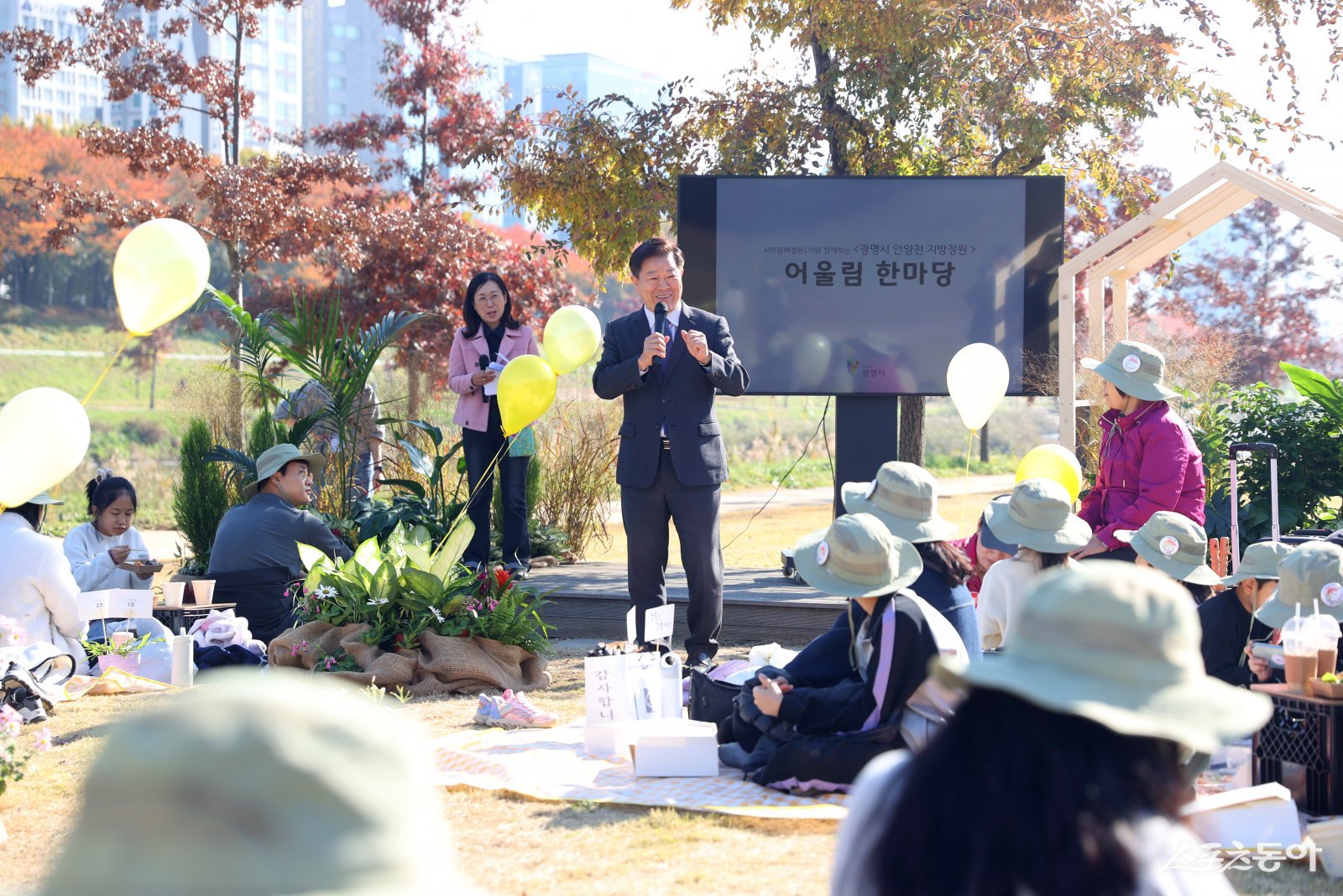 박승원 광명시장이 지난 15일 안양천 지방정원 시범구간에서 개최한 ‘정원 어울림 한마당’에 참석해 인사말을 하고 있다. 사진제공|광명시