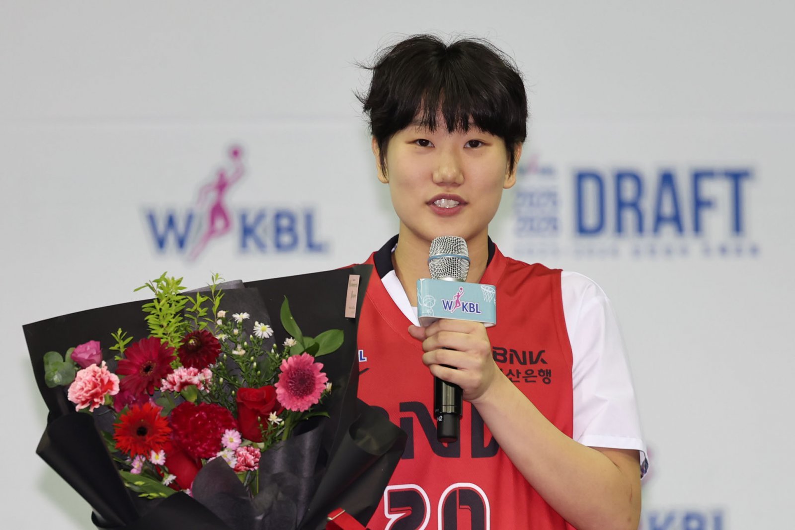 박정은 BNK 감독은 16일 부산 사직체육관에서 열릴 신한은행과 개막전에 앞서 “이원정에게 경험을 쌓게 해주겠다”고 말했다. 이원정은 이번 시즌 신인드래프트 전체 2순위로 BNK에 지명된 가드 자원이다. 8월 20일 신인드래프트에서 지명된 뒤 소감을 전하는 이원정. 뉴시스