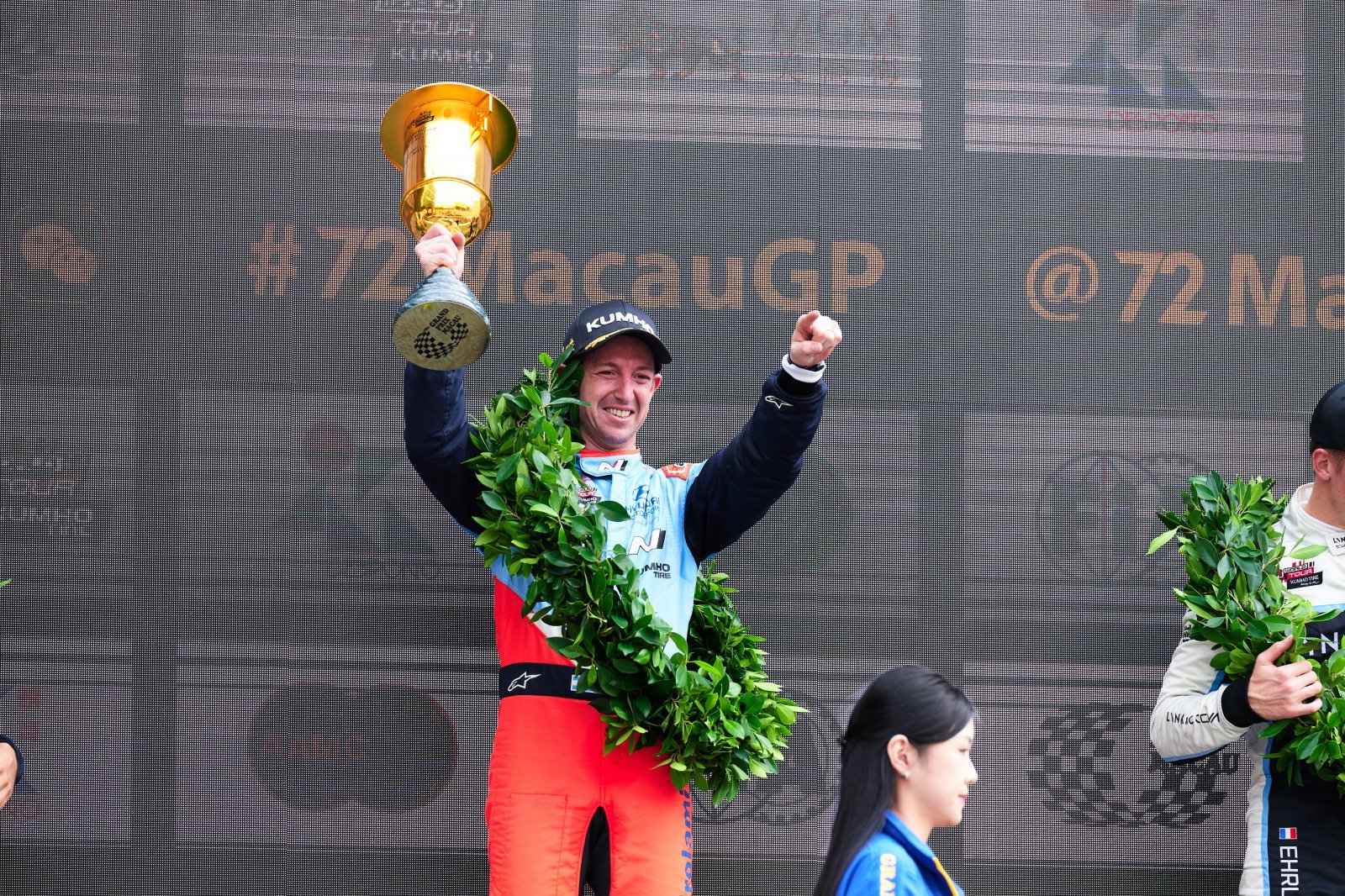 BRC 현대 N 스쿼드라 코르세 팀 소속 네스토르 지로라미 선수가 ‘2025 TCR 월드투어’ 마카오 대회에서 우승을 차지하고 포디움에서 기뻐하는 모습. 사진제공 |현대차