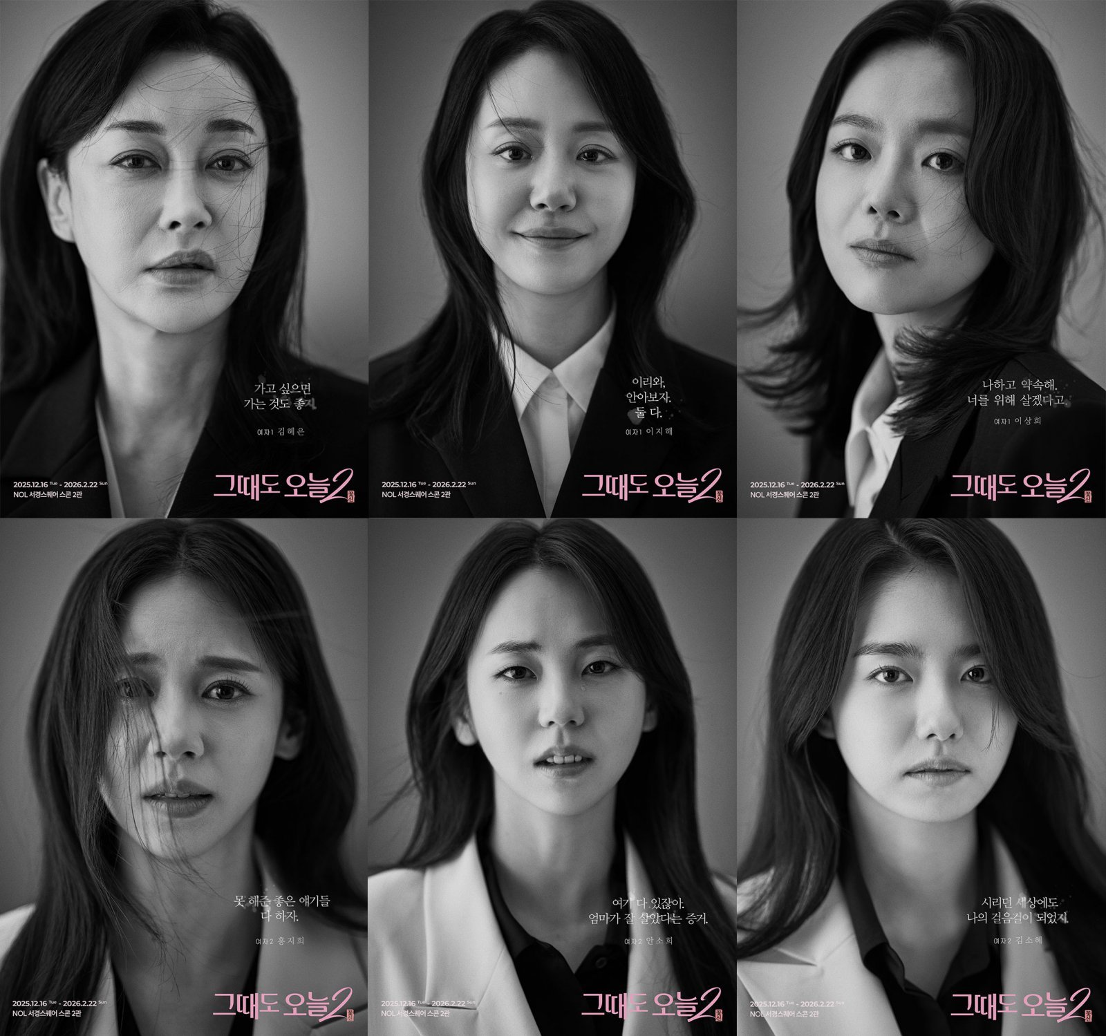 이번에 공개된 캐릭터 포스터는 작품의 분위기를 더욱 분명하게 전한다. 배경을 모두 걷어낸 흑백 이미지 속 김혜은, 이지해, 이상희, 홍지희, 안소희, 김소혜는 오직 눈빛과 표정만으로 인물의 기운을 드러냈다. 시대를 넘나드는 인물의 무게감과 여섯 배우의 개성이 담기며 공연이 전달하고자 하는 ‘보통 사람들의 힘’이라는 주제가 자연스럽게 읽힌다.