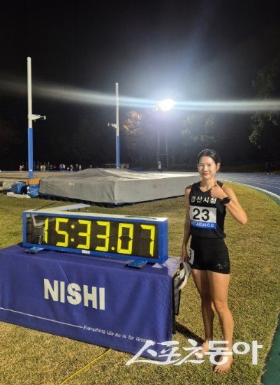 경산시청 직장운동경기부 육상팀 김유진 선수가 신기록을 경신한 후 기념촬영을 하고 있는 모습. 사진제공ㅣ경산시