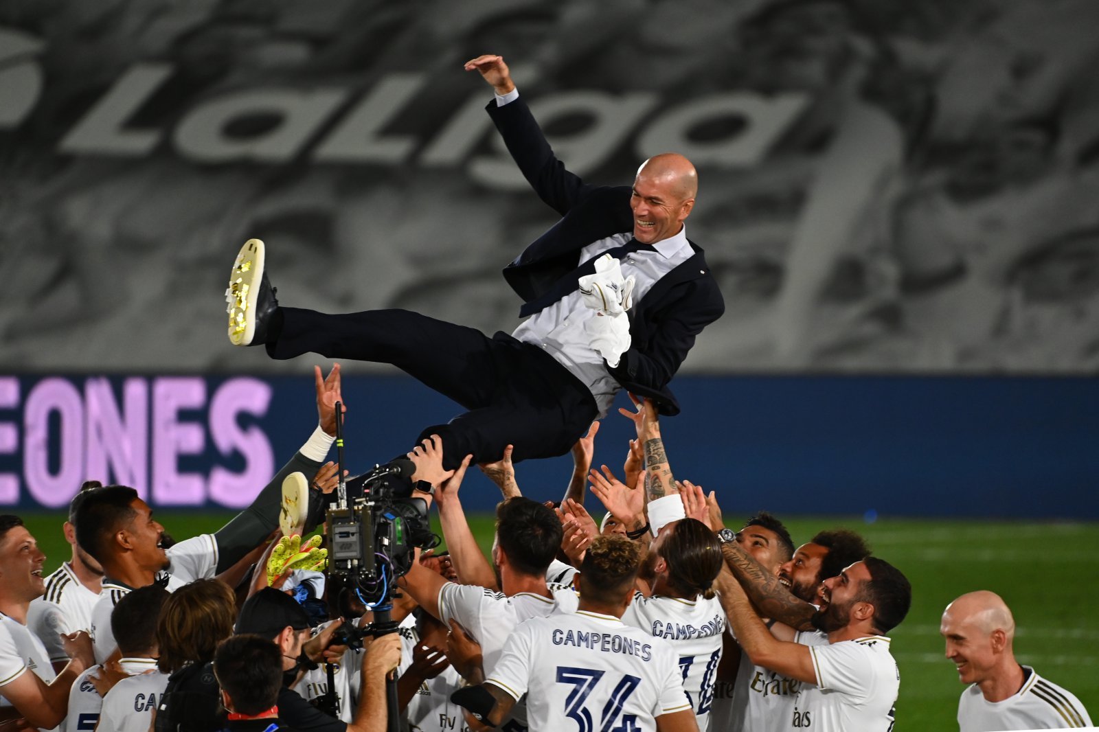 스페인 매체 ‘디아리오 아스’는 17일(한국시간) “지네딘 지단 감독의 프랑스 사령탑 복귀는 이미 눈앞에 다가와 있다. 다만 그 시점이 조금 늦춰질 뿐, 2026북중미월드컵이 끝나야만 비로소 공식화될 가능성이 높다”고 밝혔다. 2019~2020시즌 레알 마드리드의 프리메라리가 우승을 이끈 뒤 선수들에게 헹가래를 받고 있는 지단 감독. 마드리드(스페인)|AP뉴시스