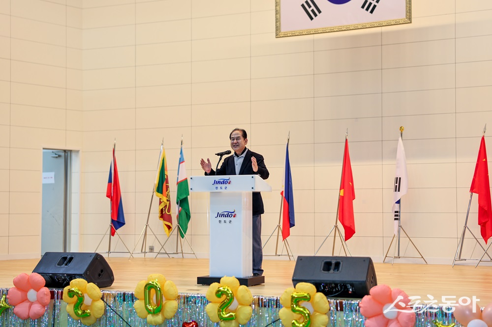 김희수 진도군수가 ‘2025년 다문화가족 한마음축제’에서 인사말을 전하고 있다. 사진제공=진도군