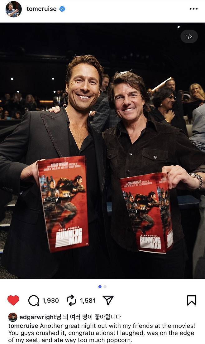 그런 글렌 파월을 위해 톰 크루즈는 영국 런던에서 진행된 ‘더 러닝 맨’ 시사회에 직접 참석하는가 하면, 이후 SNS를 통해 ‘더 러닝 맨’을 “너무 멋진 영화”라고 소개하기도 했다.