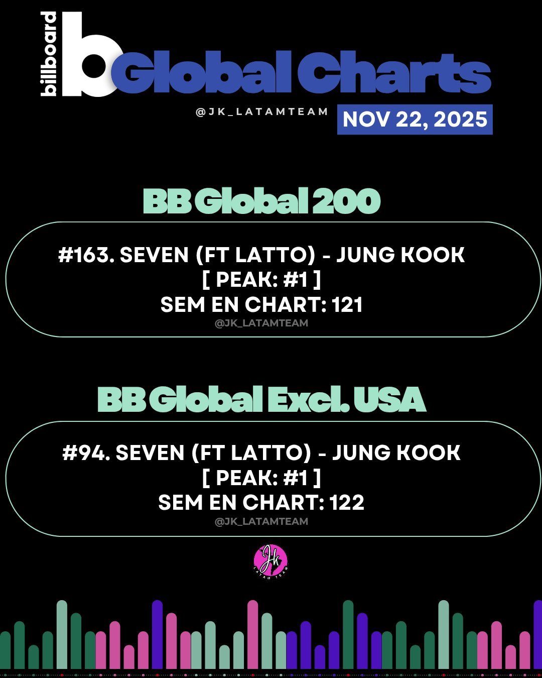 미국 음악 매체 빌보드가 발표한 11월 22일 자 차트에서 정국의 솔로 데뷔곡 ‘Seven’이 글로벌 200에서 163위를 기록했다. 2023년 공개된 이후 꾸준히 사랑받아온 이 곡은 올해 121주째 차트에 머무르며 아시아 솔로 뮤지션 중 ‘최초’이자 ‘최장’ 기록을 이어가고 있다.
