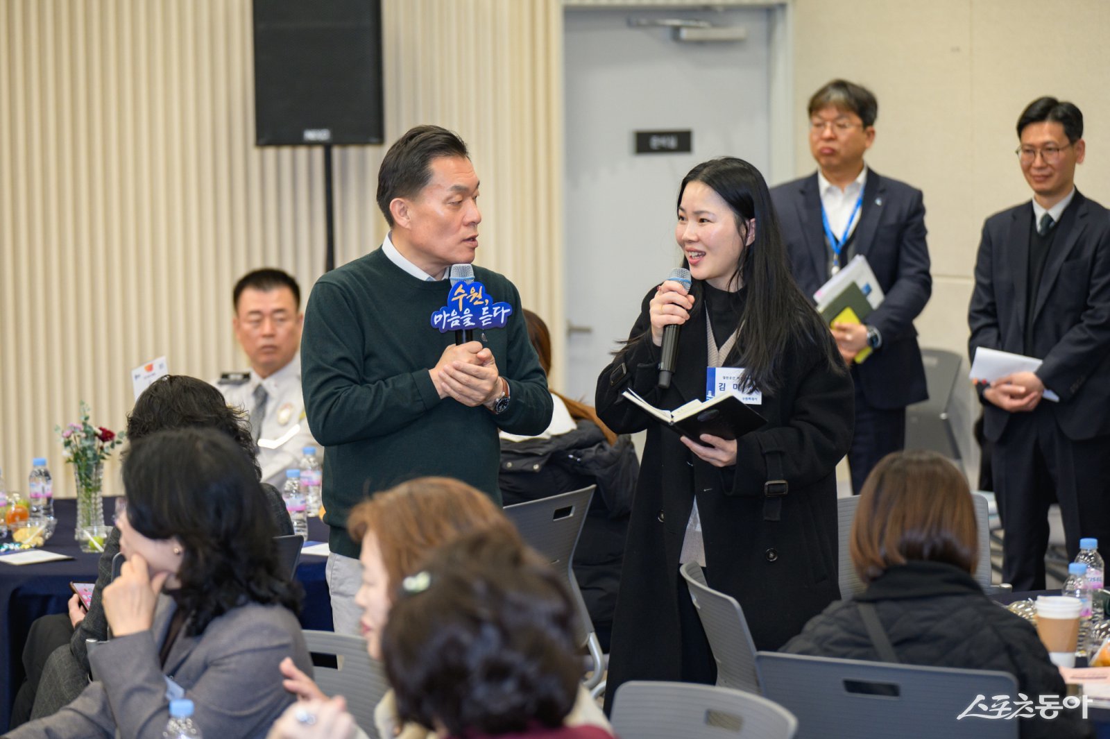 이재준 수원시장이 권선1동 새빛만남에서 시민의 의견을 듣고 있다. 사진제공|수원시
