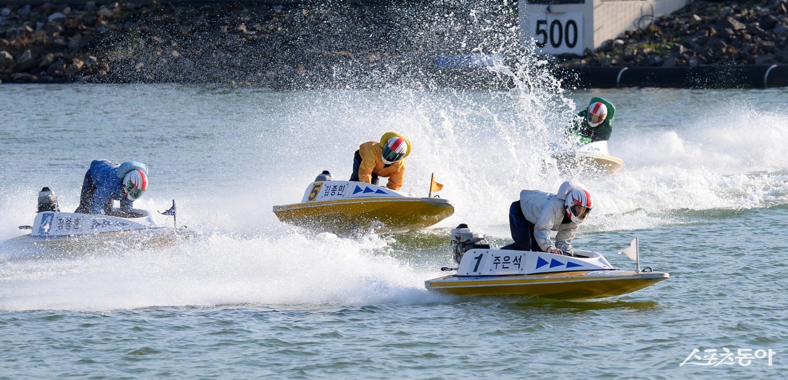 경정 선수들이 미사리 경정장에서 턴 마크를 돌며 경합을 벌이고 있다.