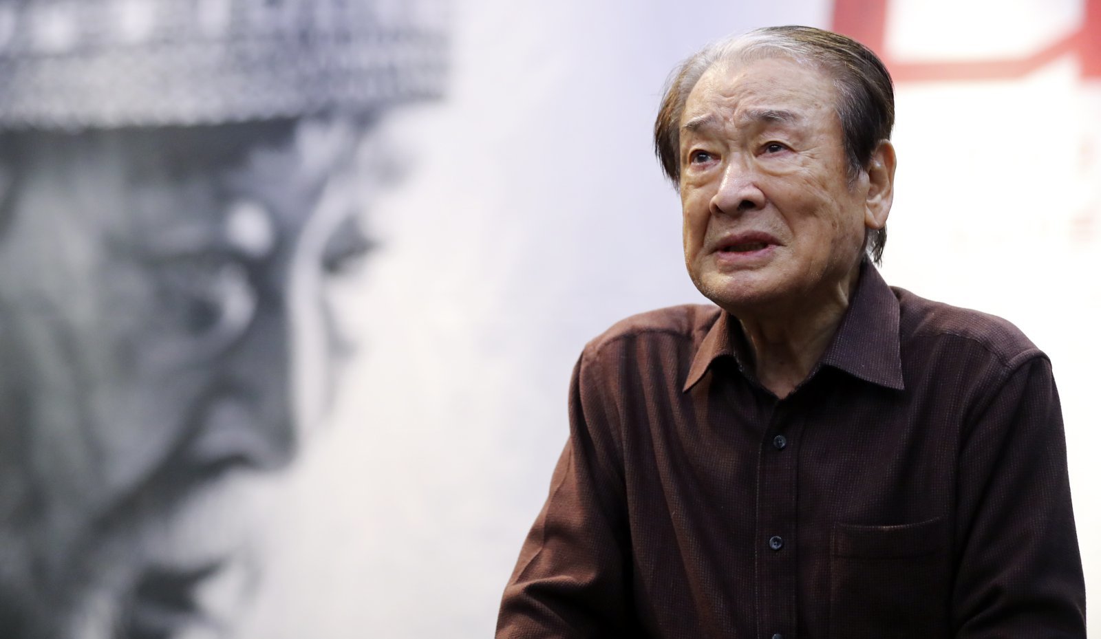 [서울=뉴시스] 최진석 기자 = 리어왕 역의 배우 이순재가 10일 서울 SNU 장학빌딩 베리타스홀에서 열린 연극 리어왕 연습실 공개 행사에서 장면시연을 하고 있다. 2023.05.10. myjs@newsis.com