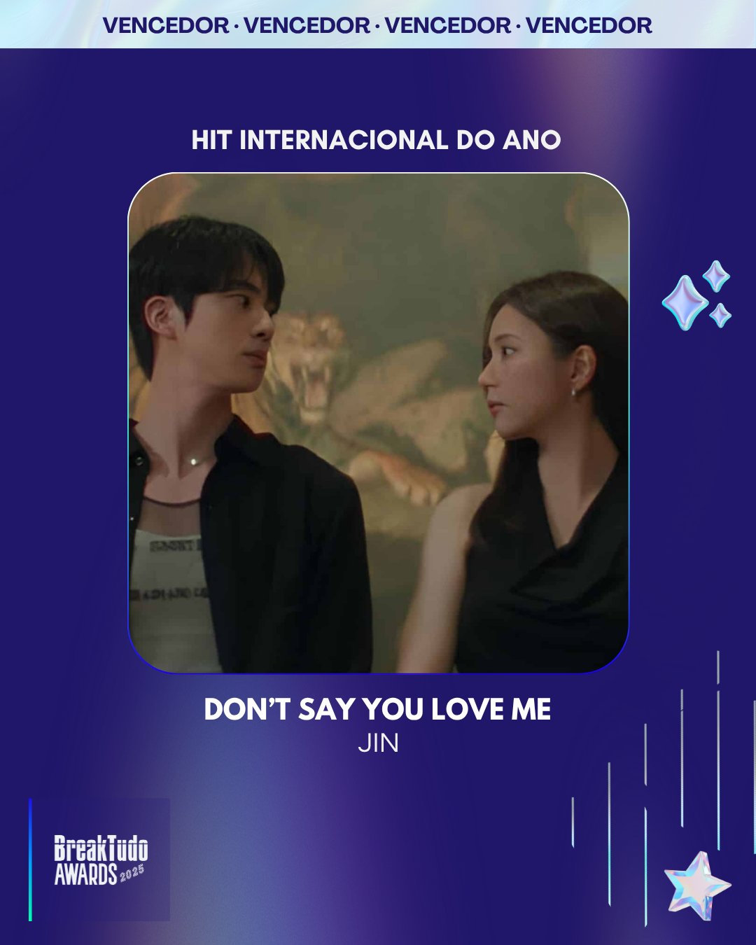 솔로 아티스트 진의 ‘Don’t Say You Love Me‘가 11월 18일 현지시간 브라질 상파울루에서 열린 ’BreakTudo Awards 2025‘에서 ‘International Hit of the Year’ 트로피를 거머쥐었다. 올해 글로벌 팝 시장을 뒤흔든 히트곡들이 대거 후보에 오른 치열한 경쟁 속에서, 진의 음악은 현지 팬들의 선택을 받으며 국제적 존재감을 다시 입증했다.