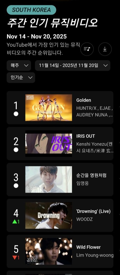 임영웅의 두 음악 이야기가 다시 유튜브 상위권을 채웠다. ‘순간을 영원처럼’과 ‘들꽃이 될게요’ 뮤직비디오가 11월 14일부터 20일까지 집계된 유튜브 한국 주간 인기 차트에서 각각 3위와 5위에 오르며 존재감을 확인했다.
